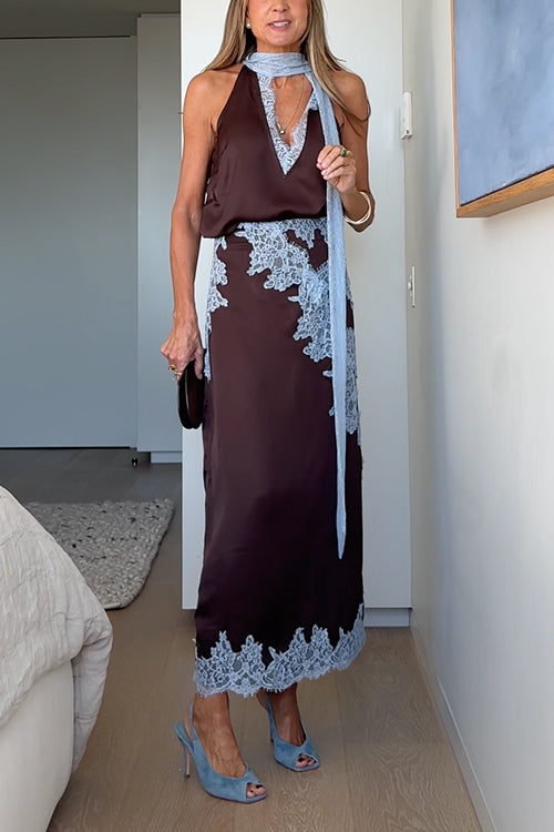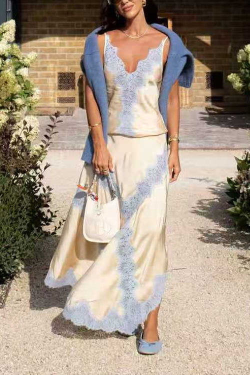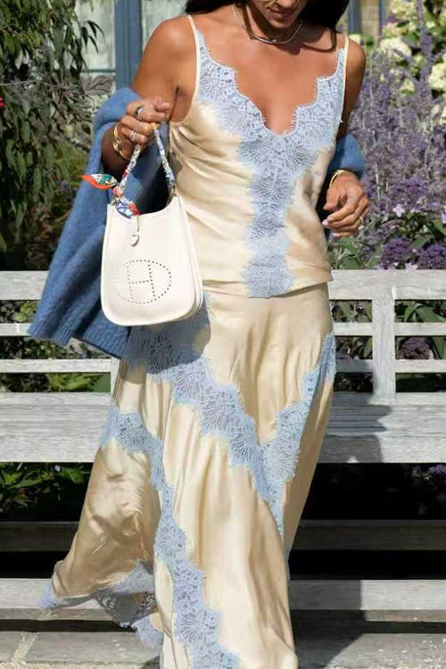 Chic Sleeveless V Neck Lace Trim Satin Top