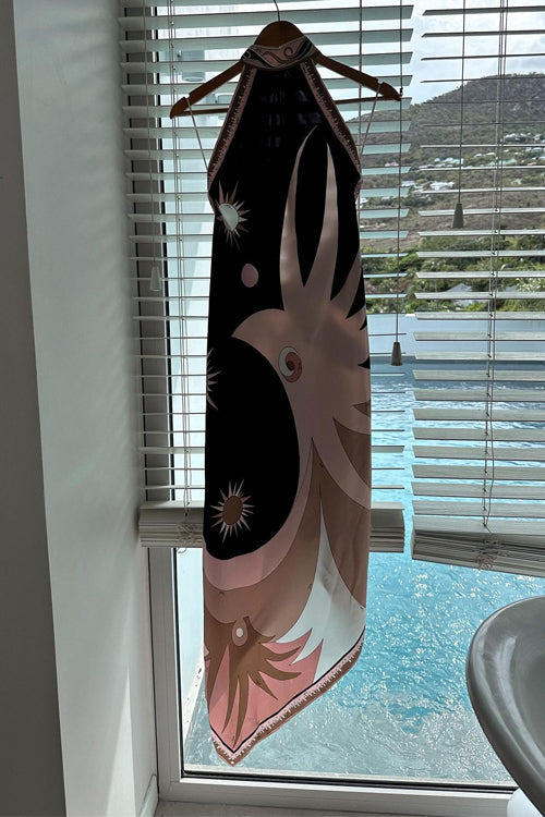 Karleedress Halter Neck Open Back Asymmetric Hem Printed Satin Midi Dress